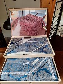 Coordinato letto matrimoniale composto da lenzuola sopra e sotto fodere e il copriletto puro cotone 100% colore blu e panna Nuovi brand Anna Versace