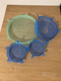 Coperchi elastici per contenitori in silicone, di 4 dimensioni diverse. Rotondi, colore blu e azzurro. Condizioni perfette