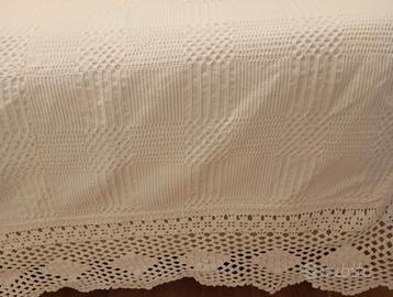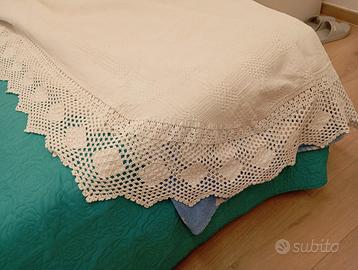 Vendo coperta antica fatta al telaio con bordo a uncinetto su tre lati, per letto matrimoniale