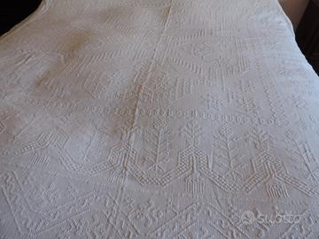 Coperta antica in cotone, per letto alla francese, lunghezza cm 235, larghezza cm. 176, con trina su due lati di cm. 24.