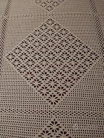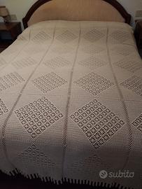 Copriletto matrimoniale in cotone fatto a mano ad uncinetto. Colore panna. Rifinito con originali e laboriose mappine. Dimensione cm. 240 lunghezza 235 larghezza. Spese di spedizione a carico del compratore.