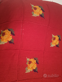 Vendo coperta di lana di colore rosso, fatta interamente a mano, costituita da quadrati uniti insieme ad un ad uno. In più è rifinita da decorazioni floreali a punto croce, ricamate sulla coperta.
