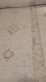 Vendo coperta in tela di puro cotone con lavorazione a mano. Inserti di filet bordata di un alto pizzo. Nuova, mai usata.