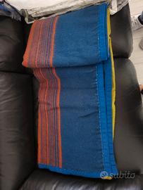 coperta lana per letto singolo, colore di base blu con righe arancioni e verdi. Lavata e profumata.