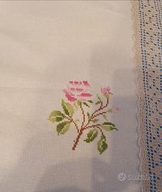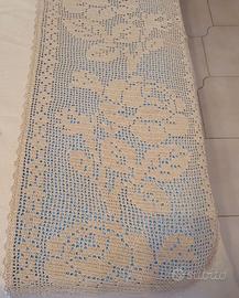 Coperta per letto matrimoniale lavorata a fasce, uncinetto alternato a lino con disegni di rose realizzate a punto a croce