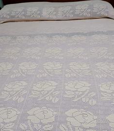 Coperta matrimoniale all'uncinetto fatta a mano color ecrù, motivo con rose.