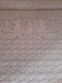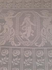 Coperta matrimoniale all uncinetto . Lavorazione filè ( unico pezzo ) su cui è stata applicata la frangia anch’essa unico pezzo .