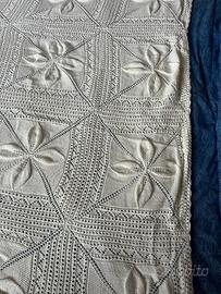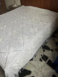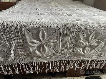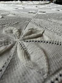 Coperta matrimoniale di artigianato tradizionale sardo, realizzata interamente a mano ai ferri in cotone bianco. Il lavoro è caratterizzato da ricchi motivi decorativi tridimensionali in rilievo, visibili sia sulla superficie che lungo i lati, che rendono il pezzo estremamente elegante e scenografico. Dimensioni molto generose: 250 × 245 cm, adatte a un vero letto matrimoniale o come copriletto di pregio. Rifinita con frange su tre lati 📌 Mai utilizzata, conservata con cura 📌 Peso: 3,8 kg, indice di lavorazione fitta e artigianale 📌 Materiale: cotone Ideale come: – copriletto di rappresentanza – pezzo d’arredo per casa elegante – oggetto artigianale da collezione. Disponibile spedizione in tutta Italia o consegna a mano nel cagliaritano.