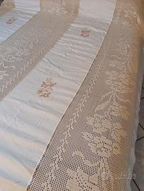 vendo particolare coperta matrimoniale a fasce lavorate all' uncinetto e decorate con disegni sulle parti telate. colore panna.