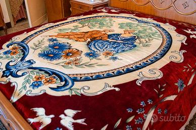In tessuto sintetico molto morbido e peloso al tatto, tipo peluche, davvero molto confortevole e calda, abbastanza spessa e pesante. Ideale in una stanza da letto matrimoniale con mobili in legno anticato o stile rustico, ma va benissimo anche in una stanza di tipo moderno. Introvabile.