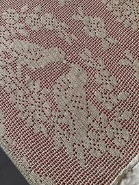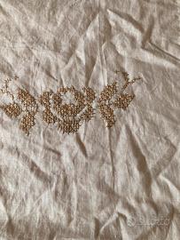 Coperta matrimoniale in lino ricamato punto a croce e uncinetto, lavorata a mano, ma da finire, con ulteriori fasce in lino e bordo inclusi