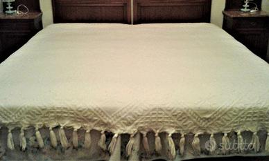 Coperta matrimoniale tessuta a mano di lana morbida, color naturale, con frange annodate nei bordi di tre lati. Misure 232 x 217 e le frange 10 cm. Le foto sono state scattate su un letto molto grande con materasso alto e la coperta sembra corta, ma verificate le misure della coperta. Ha dimensioni normali. Ben conservata, è in perfette condizioni. Visibile a San Lorenzo di Lugo (RA). Prezzo euro 250. Eventuali spese di spedizione a carico dell'acquirente. Per ulteriori informazioni contattateci.