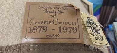 Storica coperta matrimoniale Marzotto in pura lana vergine. Un pezzo unico e da collezione, realizzato in edizione speciale per il centenario (1879-1979) delle rinomate Telerie Ghidoli di Milano. L'etichetta originale è intatta.