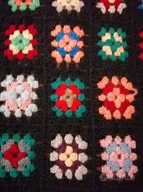 Vendo Plaid / coperta per letto singolo a piastrelle realizzata all'uncinetto con fondo nero. La coperta può essere utilizzata su un divano (come nella serie televisiva Big Bang Theory) o come coperta per la mezza stagione.