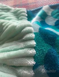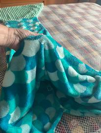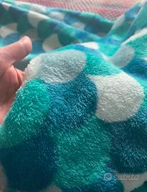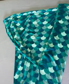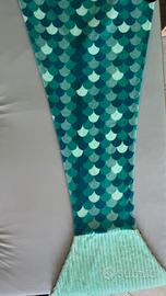 Coperta a sacco, forma di sirena, in morbida ciniglia con i colori del mare, azzurro/verde, molto confortevole e morbidissima al tatto, ideale per grandi e piccini