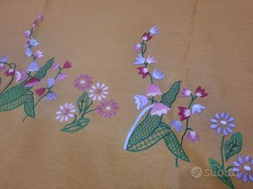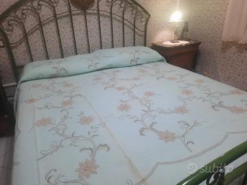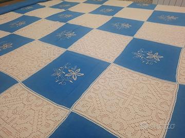 coperta in lino color oro con splendidi ricami a mano ,,coperta con quadrati all'uncinetto e quadrati in lino con ricami ...coperta color verde chiaro interamente ricamata e con inserti all'uncinetto.