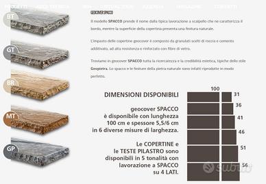 Descrizione: nelle Copertine e Teste di pilastro GeoCover Spacco si trova la ricercatezza e la credibilità estetica, tipiche dello stile Geopietra®. Lo spacco delle pietre naturali e le loro finiture sono infatti riprodotti in modo perfetto in queste lastre in pietra ricostruita. Il modello Spacco qui presentato prende il nome dalla tipica lavorazione a scalpello sui bordi, mentre la superficie presenta una finitura naturale.L’impasto è composto da granulati scelti di roccia e cemento additivato ad alta resistenza, rinforzato con fibre di vetro. Come nelle pietre da rivestimento, anche nelle copertine Spacco ritroviamo la bellezza e l’emozione del tempo trascorso. Le Copertine e le Teste di pilastro di GeoCover Spacco sono fornite, in varie misure di larghezza, con lunghezza ed altezza fisse. Il modello è completo di gocciolatoio ed è studiato per armonizzarsi perfettamente con la vasta gamma di tonalità dei rivestimenti in pietra per esterni e interni.