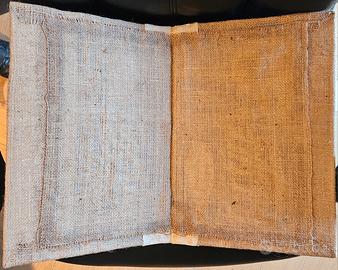 Bellissima copertina in juta/tela grezza color beige, realizzata artigianalmente e decorata con dettagli in corda. Perfetta per contenere menù o listini (basta legarli con uno spago). Misure chiuso: 40x28,5 cm; aperto: 40x56 cm ca.