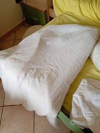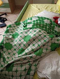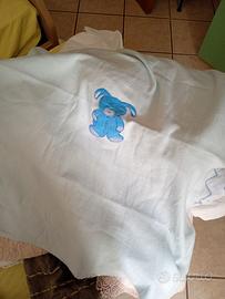 Vendo 2 copertine in pile, un piumone singolo da culla (bianco sfoderato), una sacca in pile (quella celeste ) a cui sistemare la cerniera, una coperta da lettino ( color verde a scacchi ) e il fasciatoio portatile.