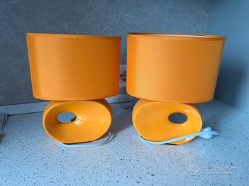Vendo due stupende abat-jour dal design vintage anni 70. La base è in ceramica lucida con una forma a ciambella ovale centrale, mentre il paralume è in tessuto color arancione tipico dei mitici anni 70.