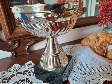 Coppa in metallo argentato su base nera. È alta complessivamente 18 cm e il diametro del calice è di 14 cm. Volendo si può togliere la base nera e diventa alta 14 cm. Molto bella per centro tavola, per contenere caramelle o fiori.
