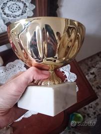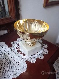 Coppa premio in metallo dorato e marmo bianco utilizzabile per centro tavola come portacaramelle o portafiori. È alta 13,5 cm e la base è un blocco di marmo bianco.