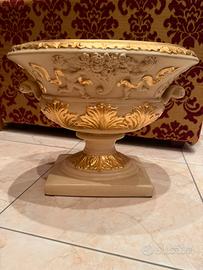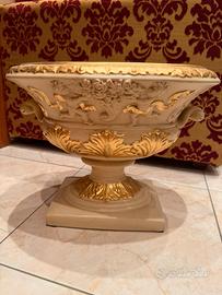 Vendo coppa vaso portafiori ideale in stile classico ideale da collocare in ingresso, un salone, soggiorno o sala da pranzo. È un pezzo molto importante ed anche molto grande, molto imponente e molto particolare, bello anche da esporre su un contro-mobile, una madia o un grande tavolo da pranzo, ma anche da tenere da appoggio sul pavimento vicino ad una tenda o ad una consolle. Come dicevo è un grande vaso a coppa, in stile impero, con putti a rilievo, tutto impreziosito dalla finitura panna e foglia oro. É veramente bello, è stato pagato da me 350,00 euro l’anno scorso, lo vendo per cambio arredamento in stile moderno, è praticamente NUOVO senza cartellino, nessun difetto. Il materiale del vaso dovrebbe essere in ceramica
