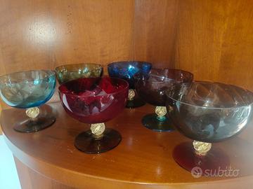 Set 6 coppette macedonia colorate in vetro soffiato di Nason Moretti, collezione Sandra. La foglia oro soffiata sul piede impreziosisce la base: le coppe hanno colori vivaci, intensi, preziosi. Il risultato è un'opera d'arte a tutti gli effetti.