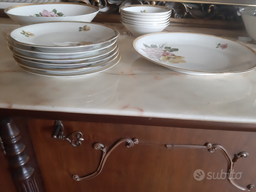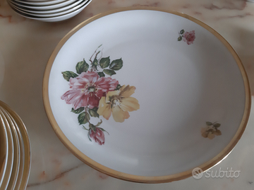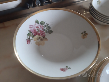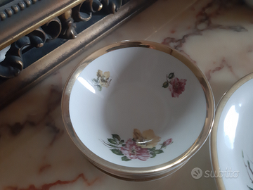 Vendo un servizio molto versatile della famosa azienda Johann Seltmann Vohenstrauss della Bavaria può essere utilizzato per servire il dolce, per servire il gelato o per servire la macedonia. Motivo floreale con i bordi in oro. È composto da una coppa grande un piatto grande sei piattini e sei coppette.