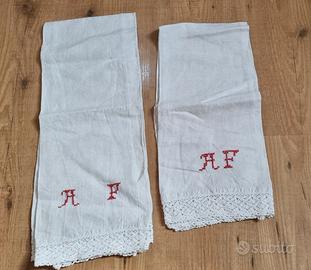 Coppia di asciugamani artigianali in eccellente lino con bordo. Dettaglio ricamo in colore rosso.