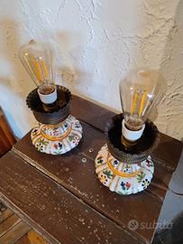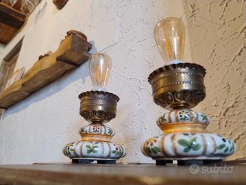 Elegante coppia di abat-jour con base in ceramica decorata e dettagli in ottone. Perfetti per aggiungere un tocco di stile a qualsiasi ambiente. - Base in ceramica finemente decorata. - Dettagli in metallo. - Alte cm 14. - Lampadine a vista con filamento (non incluse).