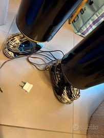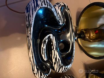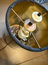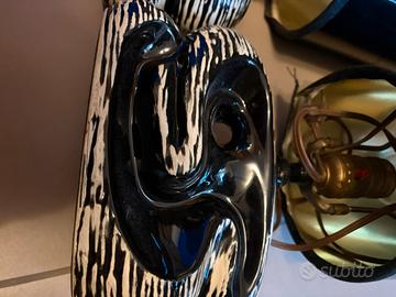 Coppia di lampade vintage America anni sessanta, base sinuosa e curva bianca e nera stile un po zebrato, porta lampada tipo ottone con accensione vintage! Paralume nero con interno oro con passamaneria da riprendere, mail paralume si può tranquillamente riparare, le lampade sono originali e perfette con l’attacco americano e sono compresi i due adattatori italiani. Oggetti unici nel loro genere. Alte circa 40cm e larghe 20 cm alla base. Perfette per comodini e consolle.