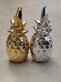 Due Ananas Decorative in resina lucida color oro e argento, leggere e pratiche. Altezza 10 e diametro 3 cm. Prezzo 6 euro, valuto offerte.