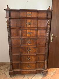 Vendo splendida coppia coordinata di mobili d'epoca. con raffinati intagli artigianali. I due pezzi appartengono alla stessa serie e presentano decorazioni a cariatide (colonne scolpite) perfettamente abbinate. 1) Armadio a un’anta: dotato di grande specchio centrale originale dell'epoca, cimasa superiore sagomata e ampio cassetto alla base. Interno capiente e funzionale. 2) Settimanale (Settimino) con 7 cassetti frontali sagomati. Caratterizzato da venature del legno simmetriche di grande impatto estetico. I mobili sono integri e presentano i normali e affascinanti segni del tempo. Valuto solo offerte serie,ritiro a carico dell'acquirente. La camera presenta anche altri pezzi di quell'epoca: Letto,due comodini,sedia capotavola, ribalta. Se interessati mando foto pure del resto e si concorda un prezzo per tutto il blocco.