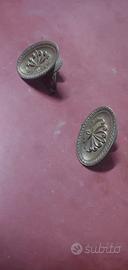 Vendo coppia di alari/andirons antichi in metallo dorato, probabilmente in ottone o lega simile, usati storicamente come supporti davanti al camino. Gli oggetti presentano un design ornamentale tipico di accessori da camino d’epoca, con motivo decorativo centrale (stemma/foglia) e tre piedi stabili. Possono essere utilizzati sia come funzionali supporti per legna (se si ha un camino tradizionale), sia come oggetti decorativi vintage per arredo, ingressi, salotti o stanze rustiche.