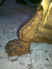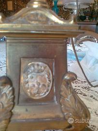 Coppia candelieri antichi provenienti da cappella privata, sulla base stemma di "araba fenice". Sono stati elettrificati da parecchi decenni con maestria e cura. bronzo (?) dorato. Doratura da ripristinare sul fusto. Altezza complessiva circa cm 55. Solo consegna a mano.