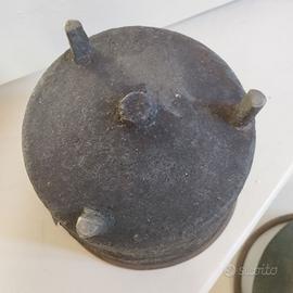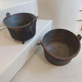 Coppia di antichi paioli in rame massiccio con manico in ferro battuto e piedini, molto pesanti, risalenti al 700.