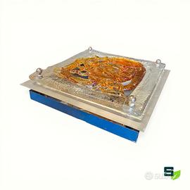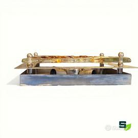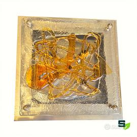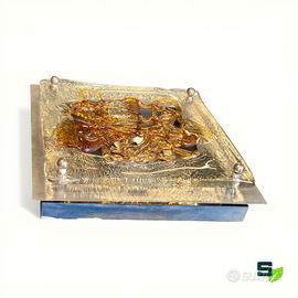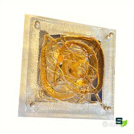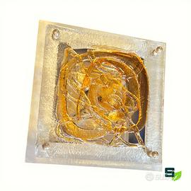 Coppia di applique in vetro soffiato trasparente e ambra su supporto quadrato in metallo spazzolato con illuminazione a 4 lampade ciascuna. Dimensioni cm. 33x33x8 Vetri scultorei bellissimi in trasparenza del designer veneziano Angelo Brotto (1914-2022). Buone condizioni come da foto, si consiglia sempre una revisione dell'impianto elettrico seppur funzionante. Ritiro gratuito in negozio oppure spedizione con corriere