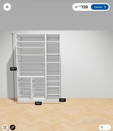 Due armadi PAX Ikea 150x58x236 organizzati come da foto e progetti allegati. Quello bianco e blu sul lato destr organizzato a scarpiera con ripiani estraibili. Ottime condizioni.
