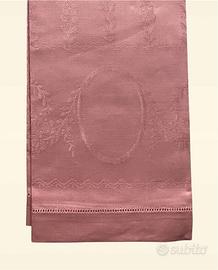2 Asciugamani ospiti in lino celeste e rosa lavorato in chiaro scuro. Misura 43 x 62 cm. Anni ’70. Nuovi Made in Italy.