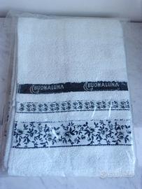 Coppia asciugamani spugna, marca Buonaluna, 100% cotone. Misure:50×100 e 40×60. Colore bianco, nero e verde chiaro.