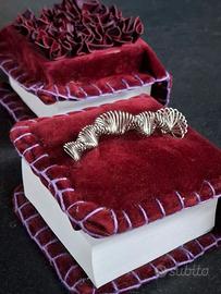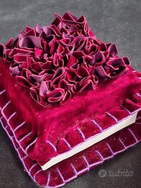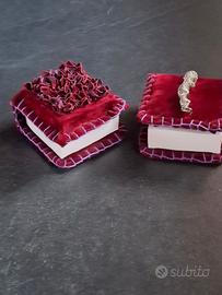 Coppia di eleganti portablocchetti promemoria da scrivania/ ufficio con lavorazione a mano. Colore rosso porpora, materiale velluto. Dimensioni 11 x 11 cm. Uno presenta decorazione a petali di rosa, mentre l'altro a spirale metallica. Nuovi, mai usati.