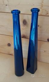 Coppia di bottiglie decorative in vetro blu cobalto in ottime condizioni, una con la base tonda ed una con la base quadrangolare. Sono alte 32 cm e hanno una capacità di 200 ml. Alla base la larghezza è di circa 5 cm.