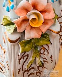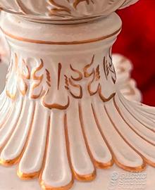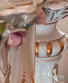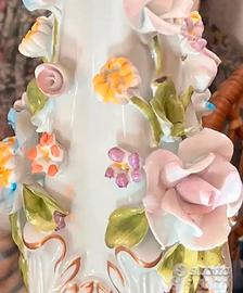 Candelabri maestosi, fiori di porcellana italiana: altezza 56 cm, con 3 fuochi laterali e 1 centrale e petali di rose: porcellana italiana. Colori allegri rendono i candelabri speciali: un vero colpo d'occhio. Due disponibili e il prezzo è riferito alla coppia. No perditempo