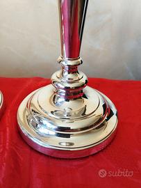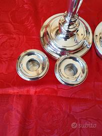 Vendo coppia candelabri in metallo argentato, stile moderno . Sono presenti i loro riduttori per contenere candele di due diversi diametri. In ottime condizioni , no bolli /ossidazioni Condizioni e dimensioni come da foto . Spese a carico del destinatario .