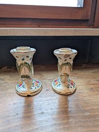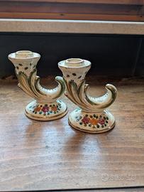 Vero affare per amanti del vintage e del collezionismo! Vendo splendida coppia di candelabri (portacandele) in ceramica artistica, caratterizzati da una raffinata forma a cornucopia.