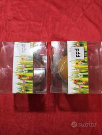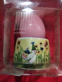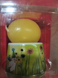 coppia candele pasquali a forma di uovo, uno giallo e uno rosa, con porta uovo in ceramica, in confezioni originali sigillate, porta uovo diametro 65 mm altezza 40 mm