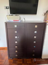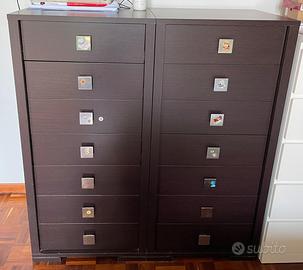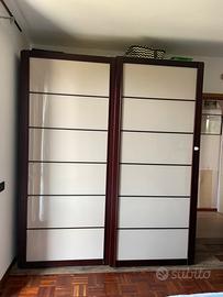 Le cassettiere sono color wengè con pomelli acciaio, misure L 60 cm , H 1.30 cm , Pr 54.5 cm Armadio a due ante scorrevoli, con ripiani e porta abiti, color wengè e crema (inserti lucidi), misure L 2.07cm, H2.38 cm, Pr 67 cm. Disponibili da metá maggio per strasloco. Trasporto carico dell’acquirente, per lo smontaggio dell’armadio, noi aiuteremo in modo da permettete a chi compra di sapere i pezzi dove vanno e farsi un piano per il successivo montaggio. Le cassettiere sono un pezzo unico, si tolgono i cassetti ma la struttura è abbastanza pesante. Per il trasporto serve un furgoncino, le cassettiere forse stanno in macchina.