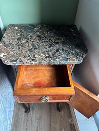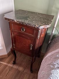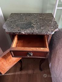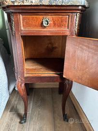 Vendo coppia di comodini antichi in legno massello con piano in marmo originale, dal design classico con gambe lavorate e dettagli in metallo. Entrambi i comodini dispongono di 1 cassetto superiore e 1 anta inferiore. Strutturalmente solidi e stabili. Presentano normali segni del tempo sul legno e all’interno, ma nel complesso sono in buone condizioni per l’età. 🪵 Materiale: legno massello + marmo 📏 Dimensioni: – Altezza: 84 cm – Larghezza: 50 cm – Profondità: 40 cm ✔ Ideali per camere vintage, case di charme, restauratori o appassionati di mobilio d’epoca. 📍 Ritiro zona Milano metro lotto oppure lago di Lecco (Colico) 🚚 No spedizione (marmo pesante)