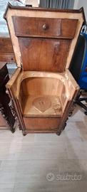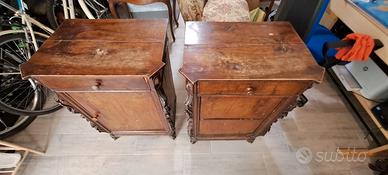 Vendo coppia di comodini antichi in legno massello, risalenti ai primi del ‘900. I mobili presentano una bella struttura solida con dettagli decorativi laterali intagliati. Uno dei due è un particolare comodino “toilette” con vano interno originale, tipico dell’epoca. Condizioni buone strutturalmente, con segni del tempo visibili su piano e superfici (come da foto), ideali per chi ama il fascino dell’antico o per un eventuale restauro conservativo. Perfetti per arredamenti rustici, case di campagna, B&B o progetti shabby chic. Vendita preferibilmente in coppia. 58x42 x 84h